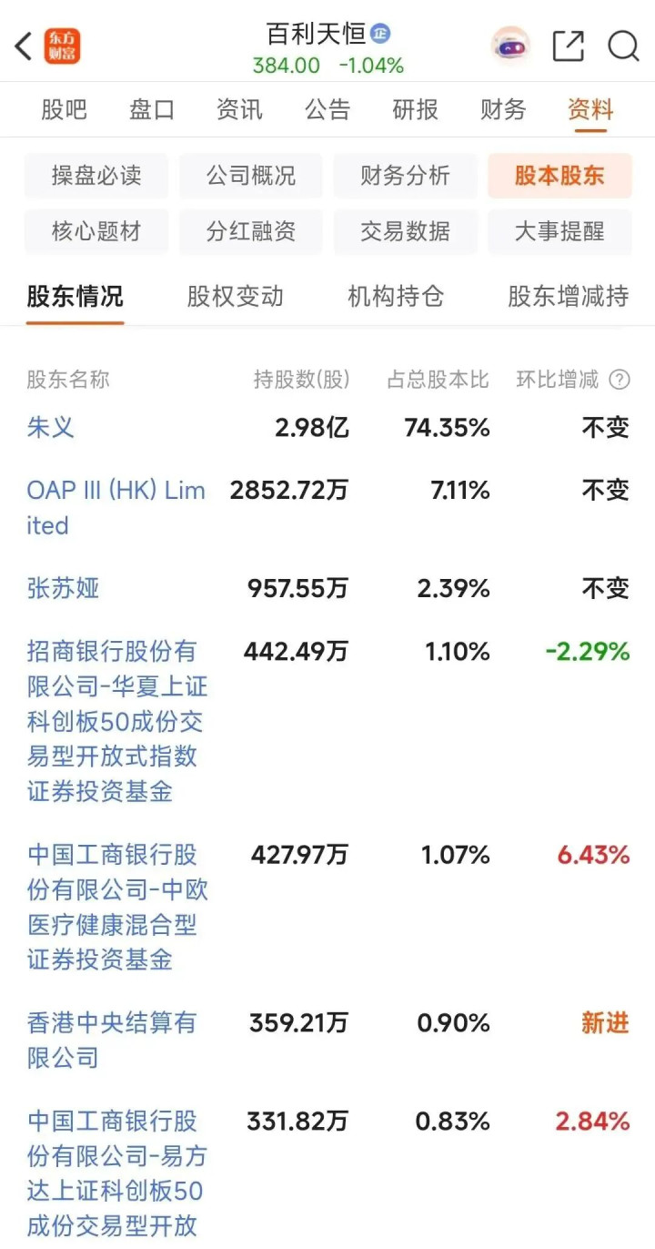 公开信息显示,百利天恒成立于1996年,早期以化学仿制药和中成药业务起步,2011年开始布局全球创新生物药领域。2023年1月,百利天恒登陆科创板,发行价为24.7元/股,募集资金9.88亿元。以9月8日收盘价计算,百利天恒自上市以来的股价涨幅已高达14倍。作为百利天恒的控股股东,朱义持有百利天恒74.35%的股份,对应市值已超千亿。